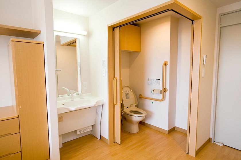 車椅子でも使いやすい、洗面台と2面開きドアのトイレ。