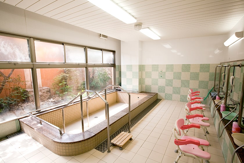 大浴場で坪庭を眺めながら入るお風呂は格別です。他にも、個浴や機械浴などがあります。